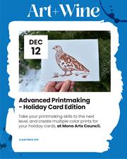 Art & Wine: Advanced Printmaking ~ Holiday Card Edition with Elody Teefy. Take your printmaking skills to the next level and create multiple color prints for your holiday cards! Enjoy a beverage of your choice and share some holiday cheer with fellow aspiring printmakers.