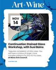 Art & Wine: This Advanced Stained Glass class is a continuation glass workshop , where you will have a choice of larger and more challenging stained glass patterns to create a beautiful piece. You will be expertly guided through the process by Susi Bains of Owl Moon Studios. This class will start at 5PM and run until 9 or 9:30!